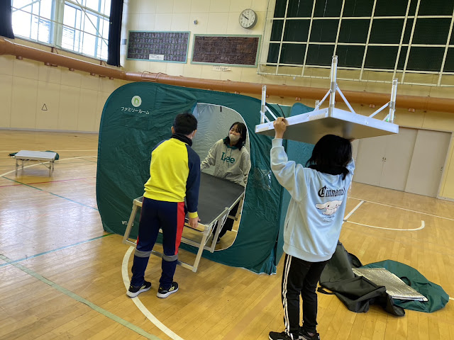 1・2年生は「防災カルタ」と防災クイズDVD、5年生はテントの設営等、避難所開設体験を行いました。